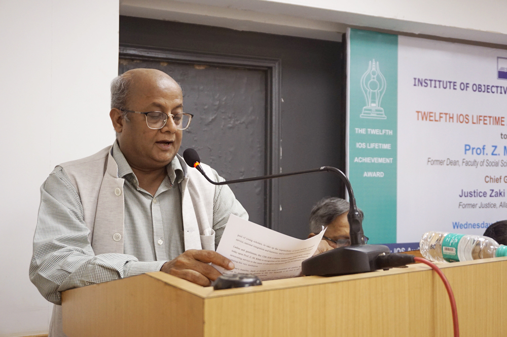 In his welcome speech, the secretary general of the IOS, Mr. Mohammad Alam, highlighted the activities of the Institute. He said that during its existence spanning four decades, the Institute engaged itself in working in several areas. These included research on status of deprived sections, particularly the Muslims. A number of projects were undertaken to study the exact position of their socio-economic plight. Reports of these studies and surveys and the outcome of research were published in book form. The Institute has so far published more than 400 titles on politics, sociology, law, religion etc., in English, Urdu and Hindi. With a view to entering into cooperation with the institutions of higher learning, a number of MoUs (Memoranda of Understanding) with reputed universities and institutions from India and abroad have been signed by the Institute. These MoUs are aimed at organising joint programmes for academic exchange. The IOS caravan is continuing its on-going journey under the guidance of its founder-chairman and now the chief patron, Dr. Mohammad Manzoor Alam. The Institute has honoured individuals, institutions and NGOs, which have rendered invaluable service to national life with the IOS Lifetime Achievement Award. So far, 11 personalities have been honoured with the Award. The twelfth IOS Lifetime Achievement award goes to Prof. Z. M. Khan in recognition of his service in the field of education, administration, planning, organisation and implementation.