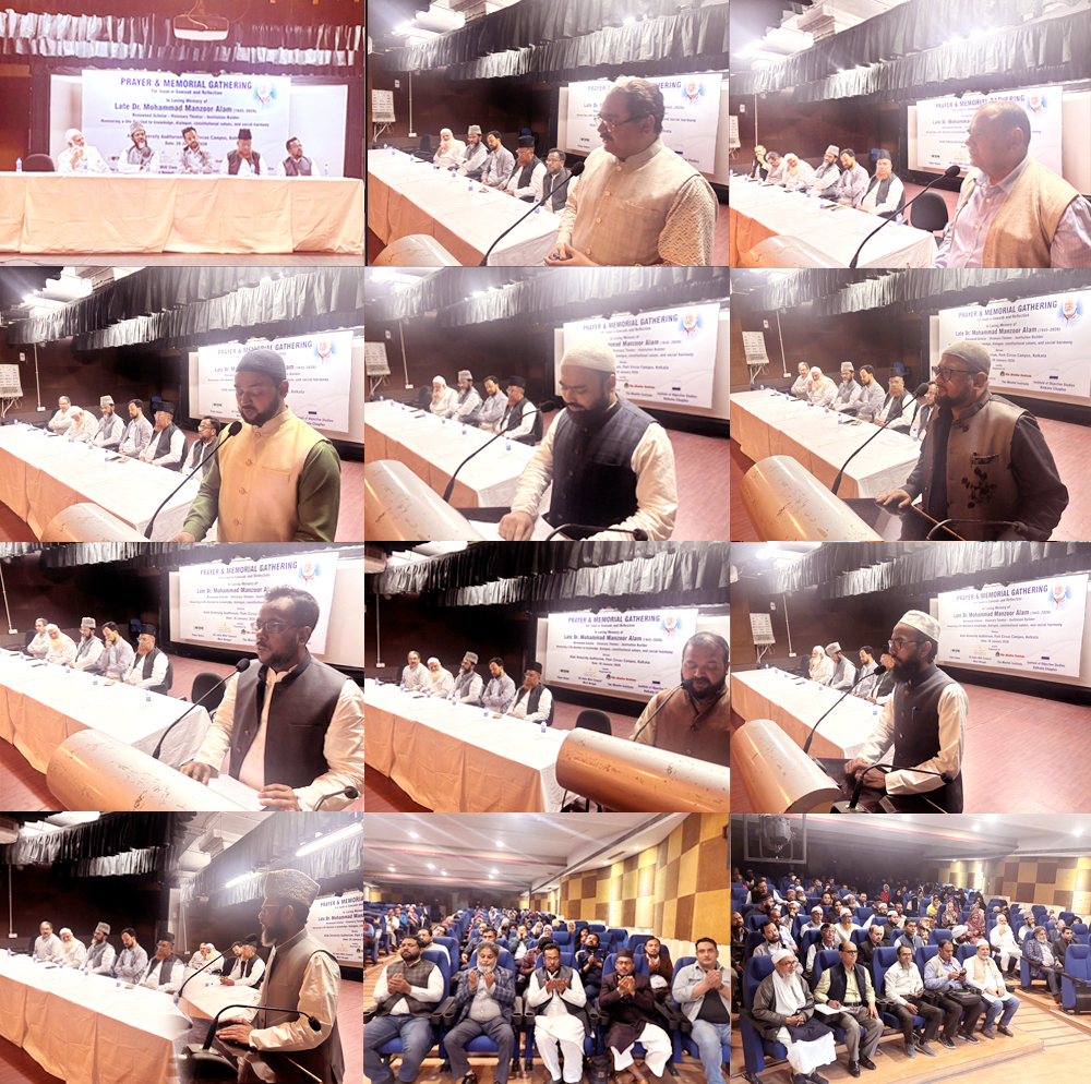 Kolkata, January 28: A dignified Prayer and Memorial Meet in remembrance of the renowned scholar, visionary thinker, and institution builder Dr. Mohammad Manzoor Alam was held successfully today evening at Aliah University’s Auditorium, Park Circus Campus, Kolkata. The programme was jointly organised by Puber Kalom; All India Milli Council (West Bengal); The Muslim Institute; and the Institute of Objective Studies (IOS), Kolkata Chapter.